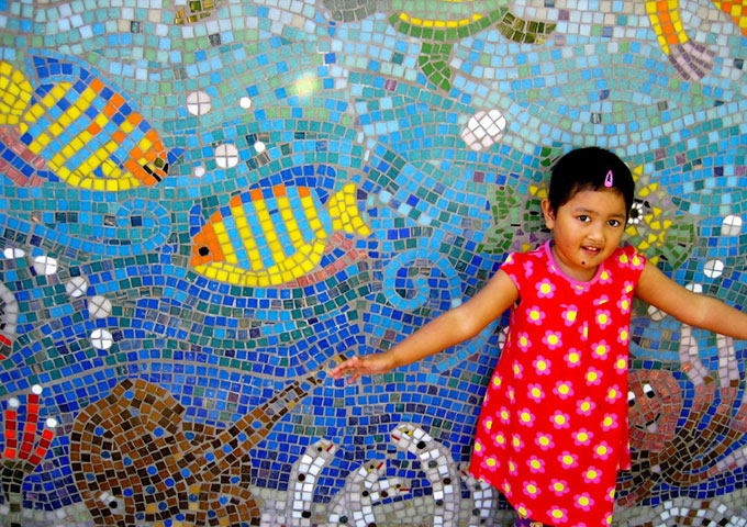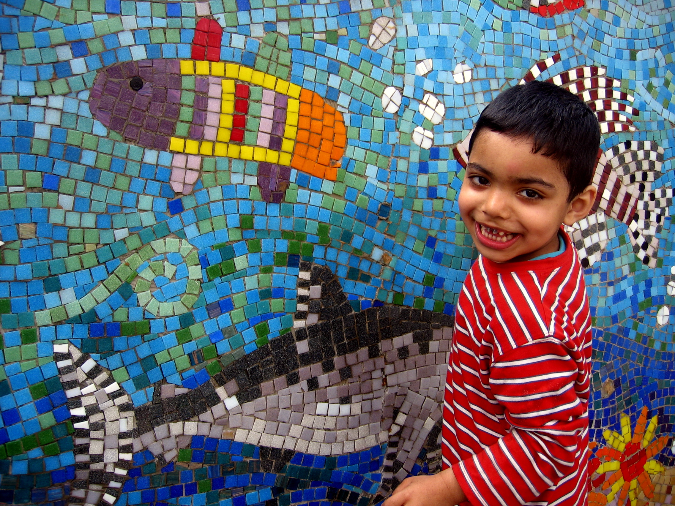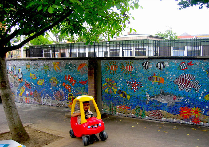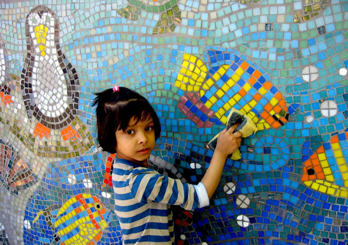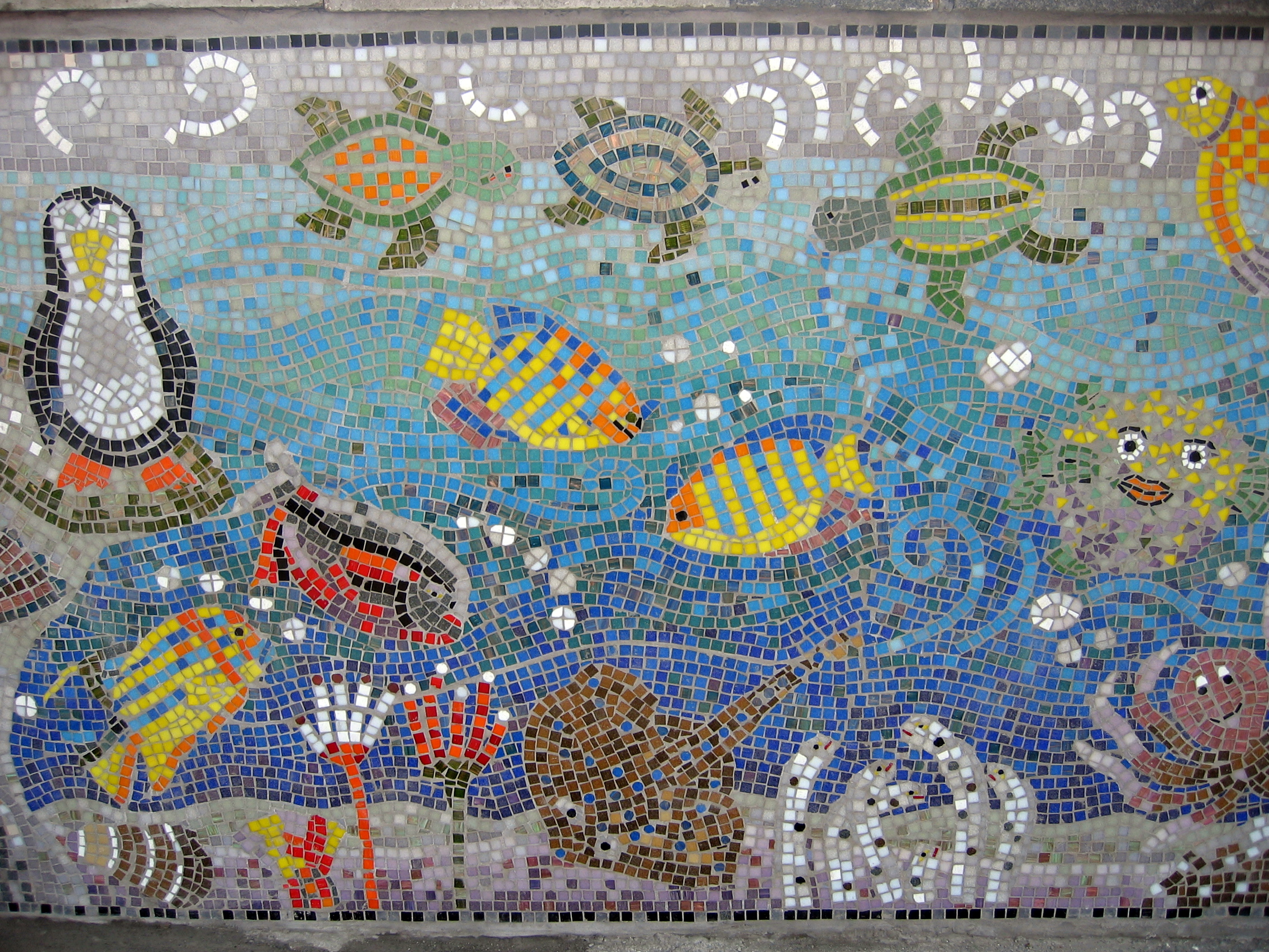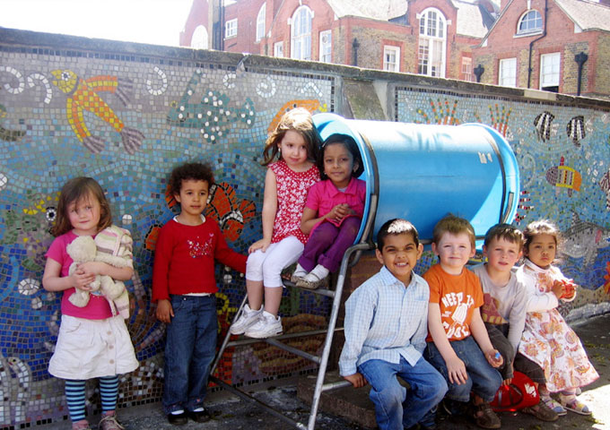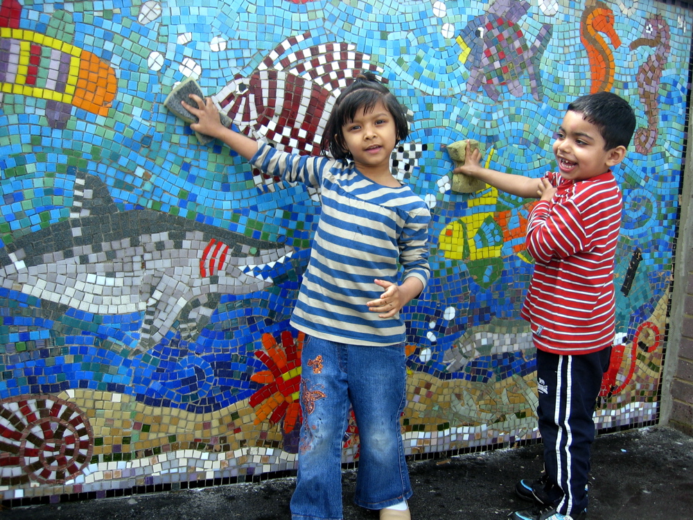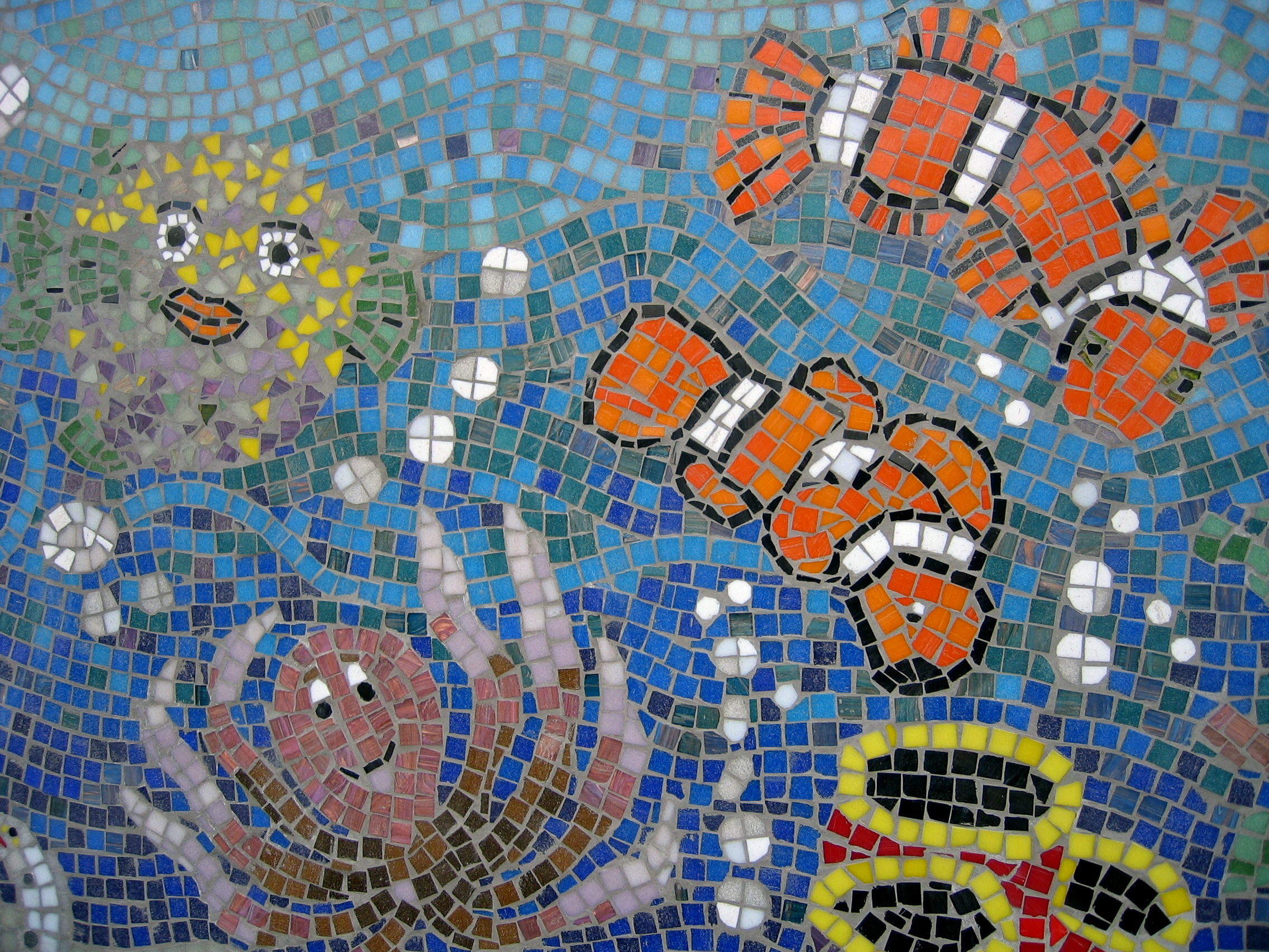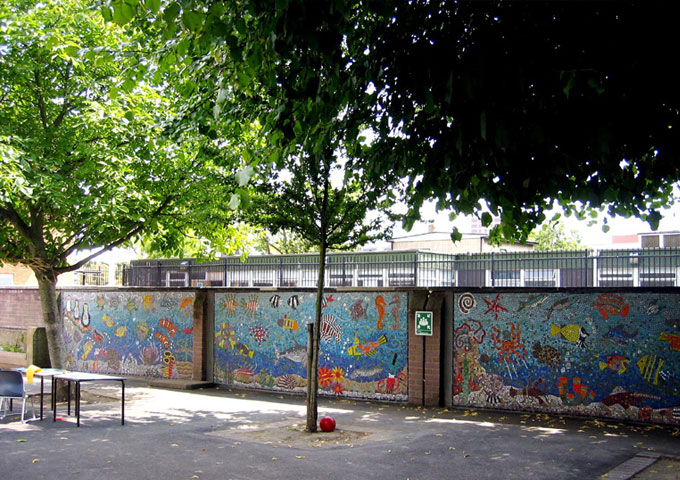 A lovely mosaic project for Ocean Children’s Centre working with early years nursery (ages 3-5) and adult volunteers from an East London based law firm. We explored extensively the theme of the ocean to cover three large panels in the nursery out-door play area. We introduced the project with a trip to the London Aquarium for education and inspiration. We set up observational drawing sessions after visits to the fish markets. We also experimented with collage and panting to get them used to ‘painting with tiles’.