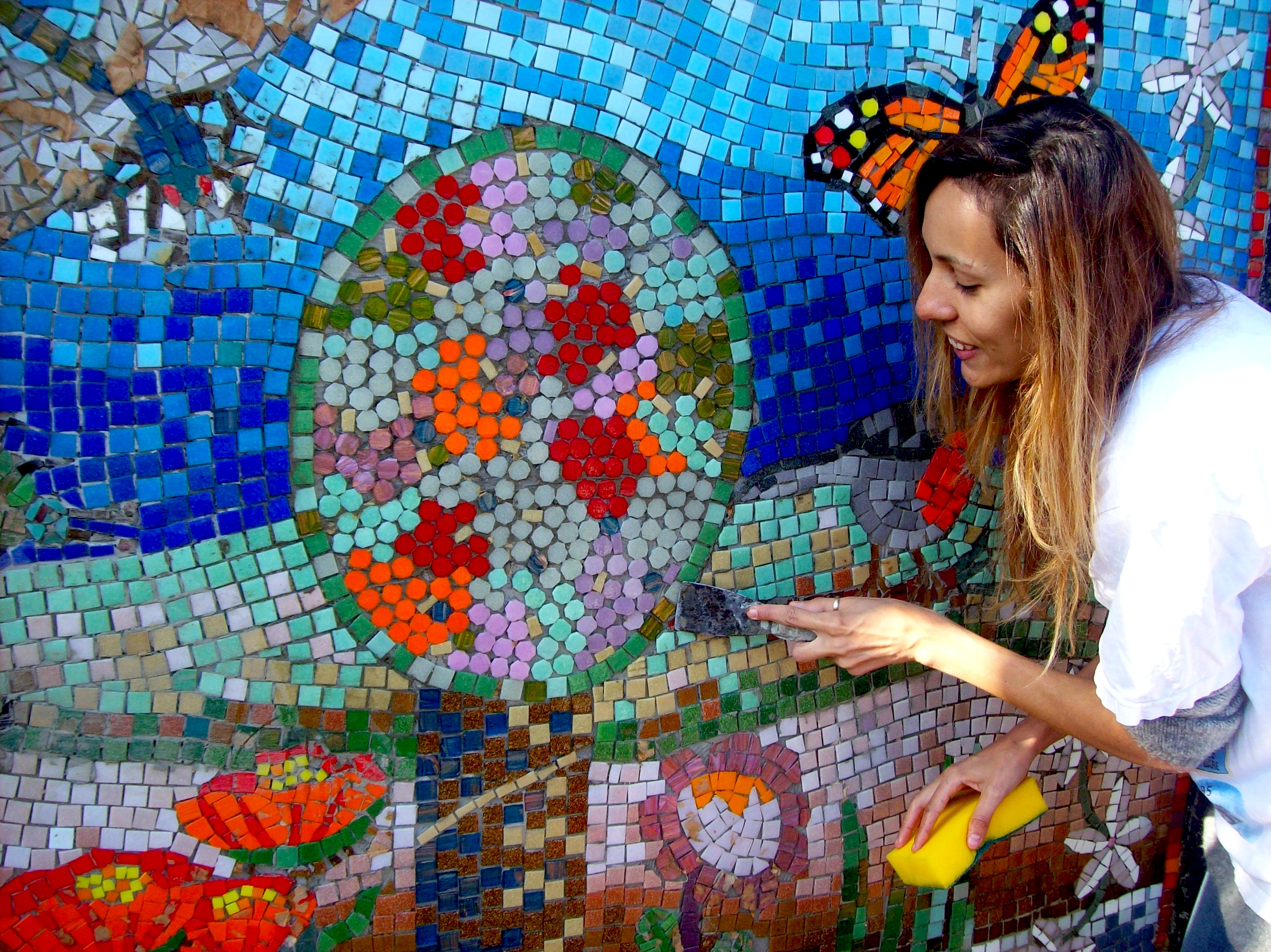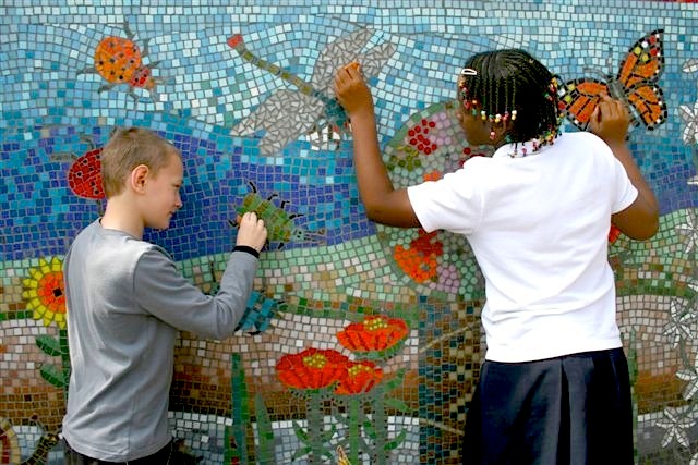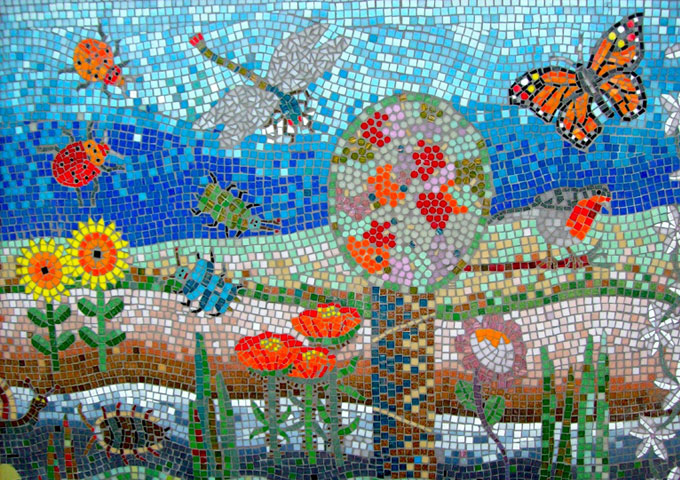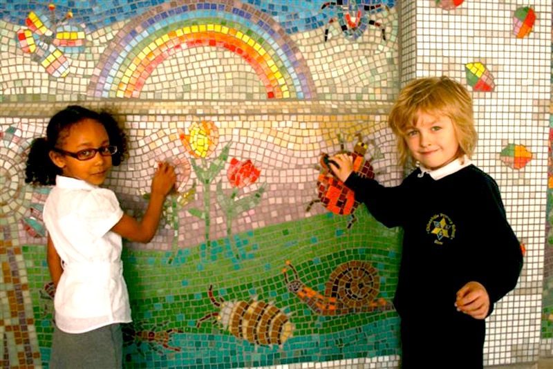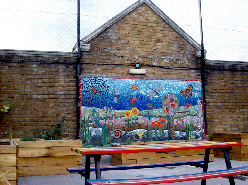 In collaboration with the pupils of Chisenhale Primary School, housed in a beautiful Victorian building, we produced 2 exterior wall mosaic panels for their roof garden and lower ground spaces. We produced images based the theme of local gardens and all their inhabitants.