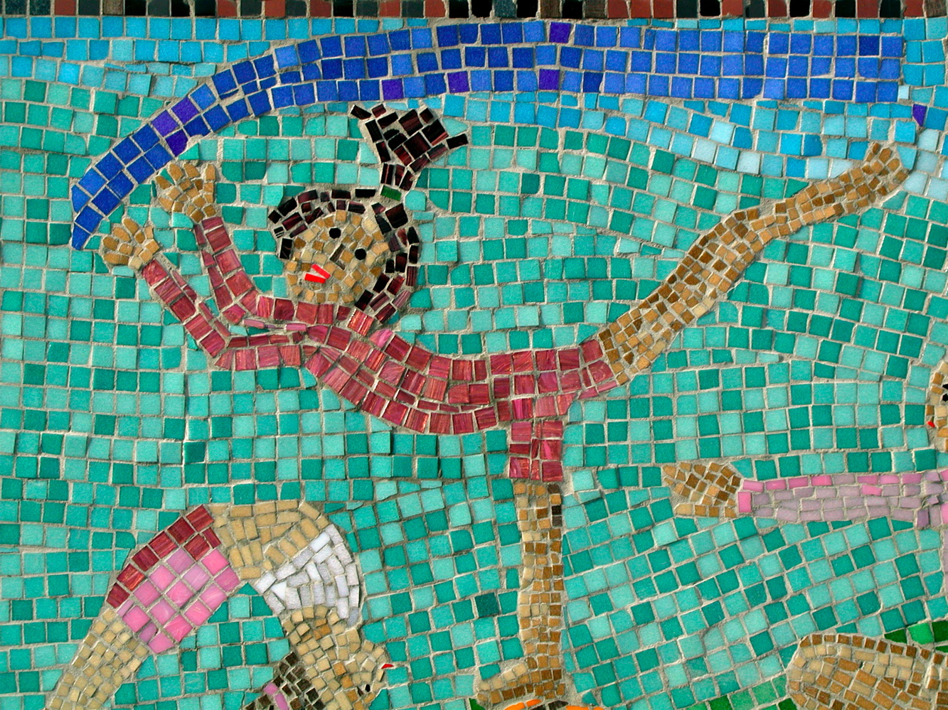 The mosaic was split into three sections using both the direct and indirect methods and with larger cut ceramic tiles and smaller glass mosaic pieces.