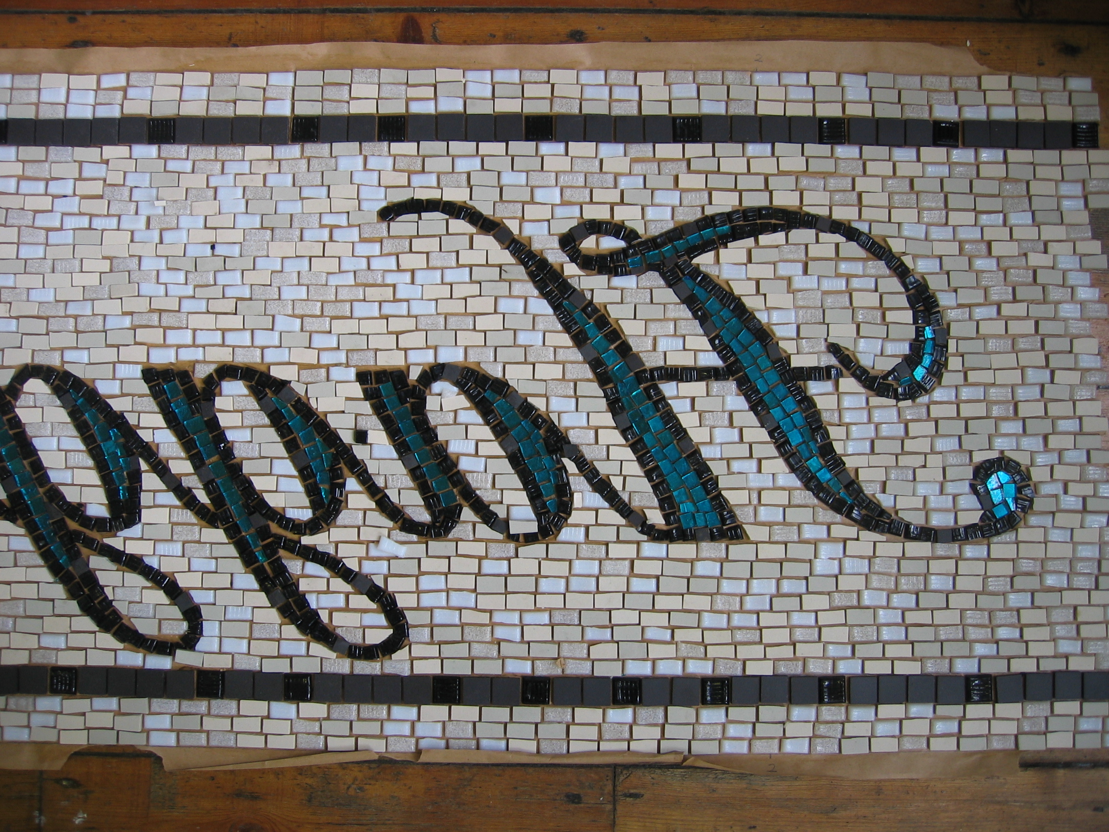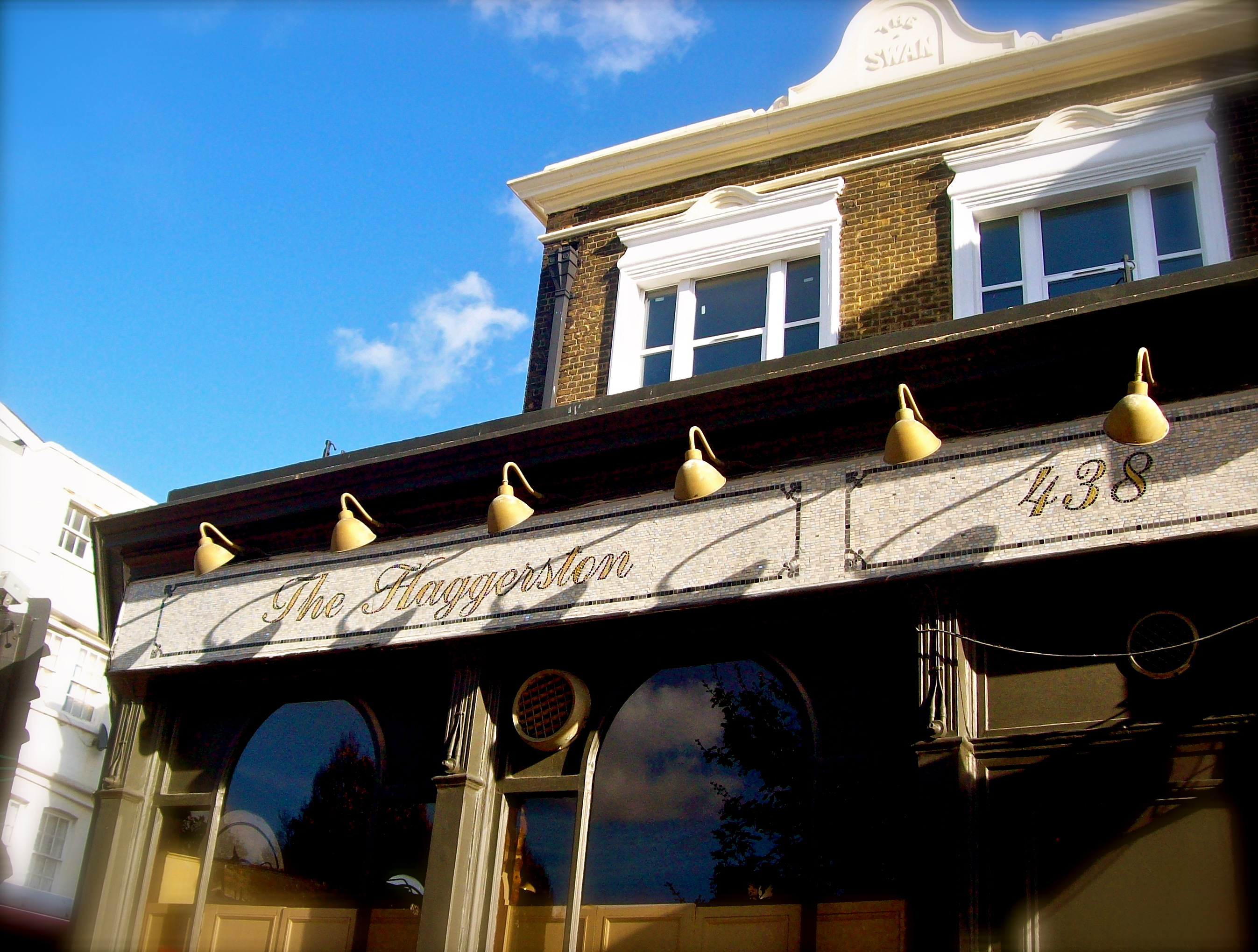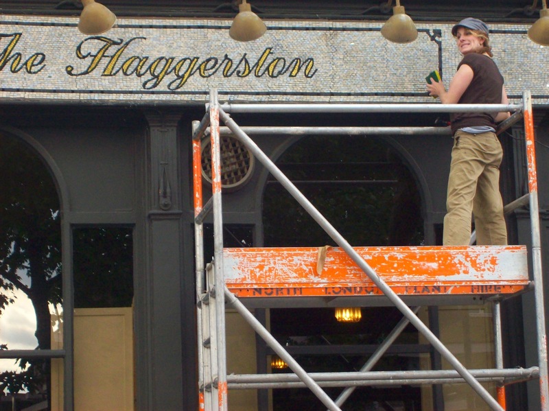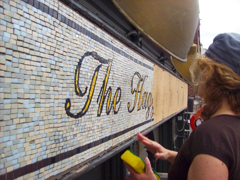 Bespoke Signage for the very popular Haggerston Pub in Kingsland Road, Dalston London. Classic style lettering in hand cut gold leaf mosaic glass set against white matt ceramic. Includes inserts of mirror glass giving off a subtle effect of shimmering refracted light.